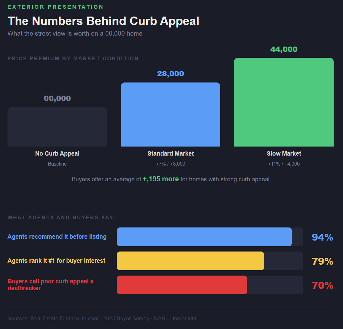 A buyer forms their first impression of a property within seven seconds of arriving. In most cases that impression is formed even before they step out of the car, and in a growing number of cases it is formed before they ever leave their own home, when they scroll past the exterior photo in an online listing. Research published in a peer-reviewed real estate finance journal found that homes with strong curb appeal, defined as tidy landscaping, a well-maintained exterior, and an inviting entryway, sell for an average of 7% more than comparable homes in the same neighborhood. In slower markets where buyers have more leverage, that premium climbs to between 10% and 11%. On a $400,000 home that represents a difference of $28,000 to $44,000 attached to nothing more than how the property looks from the street.