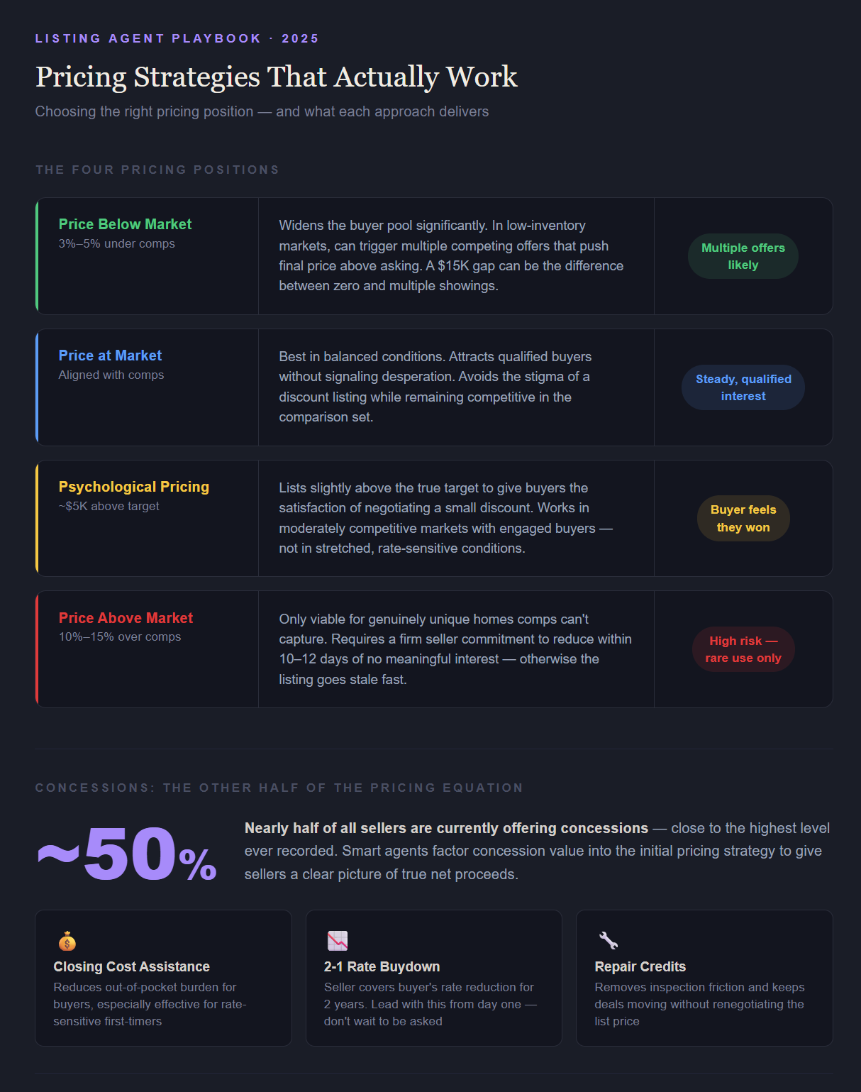 Concessions have become a meaningful part of the 2025 pricing conversation. Nearly half of all sellers in the current market are offering concessions, close to the highest level ever recorded. These include closing cost assistance, mortgage rate buydowns, and repair credits. A 2 to 1 rate buydown, where the seller covers the cost of reducing the buyer's interest rate for the first two years, has become a particularly effective tool in markets where buyers are rate-sensitive. One agent in Colorado recommended leading with this offer from day one rather than waiting for buyers to ask. Factoring concession value into the initial pricing strategy gives agents a more complete picture of net proceeds and helps sellers understand the real cost of holding firm on an inflated price versus offering genuine value to buyers who are ready to move.