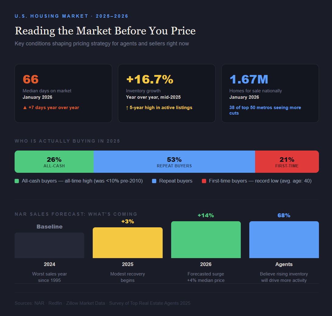 Pricing a home correctly requires understanding what kind of market you are actually operating in, not the market from two years ago and not the market a seller hopes exists. In 2025, the U.S. housing market experienced one of its most significant slowdowns in over a decade. Existing home sales ended the year roughly flat with 2024, which was itself the worst year for sales since 1995. Total inventory rose 16.7% year over year by mid-2025, reaching its highest level in five years. More homes competing for fewer buyers shifts negotiating power sharply toward buyers, and listing agents who do not account for that shift in their pricing strategy are setting their clients up for a long, painful process.