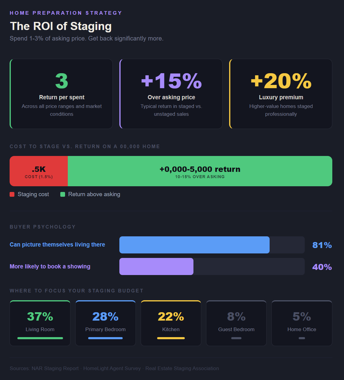 Not every room carries equal weight in a buyer's eyes. The living room is consistently ranked as the most important space to stage, cited by roughly 37% of agents as the highest priority, followed by the primary bedroom and kitchen. Guest bedrooms and home offices rank at the bottom. The practical takeaway is that staging budgets should be concentrated where buyers spend the most mental energy during a viewing. Decluttering alone, which costs nothing beyond time, is the single most recommended preparation step cited by agents across the board. A clean, neutral, well-lit space with thoughtfully arranged furniture tells buyers that the home has been cared for and that they can move in without immediate work. That perception, once formed in the first few minutes of a showing, is very difficult for competing unstaged properties to overcome.