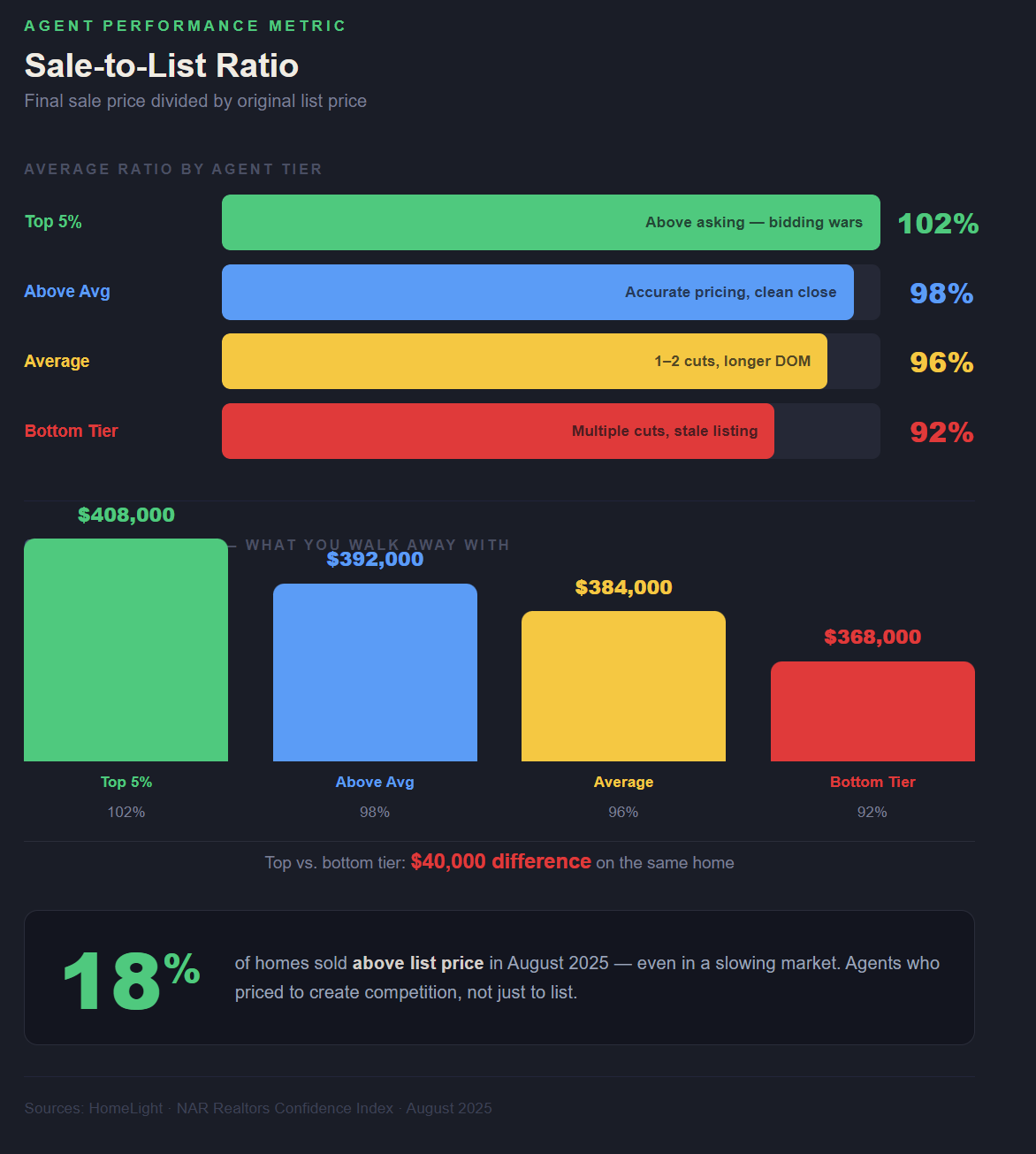 Top agents separate themselves from average agents most clearly in this metric. HomeLight data across millions of U.S. transactions shows that the top 5% of real estate agents sell homes for as much as 10% more than the average agent. On a $400,000 home, that is a $40,000 difference in the seller's pocket. The sale to list ratio is one of the primary inputs in that performance gap. Agents who price accurately from the start, position listings competitively, and manage the negotiation process with discipline tend to cluster at or above 100% in this metric. Agents who routinely allow sellers to list above market, then chase the price down through multiple reductions, tend to show ratios well below 100% over time. The track record does not lie.