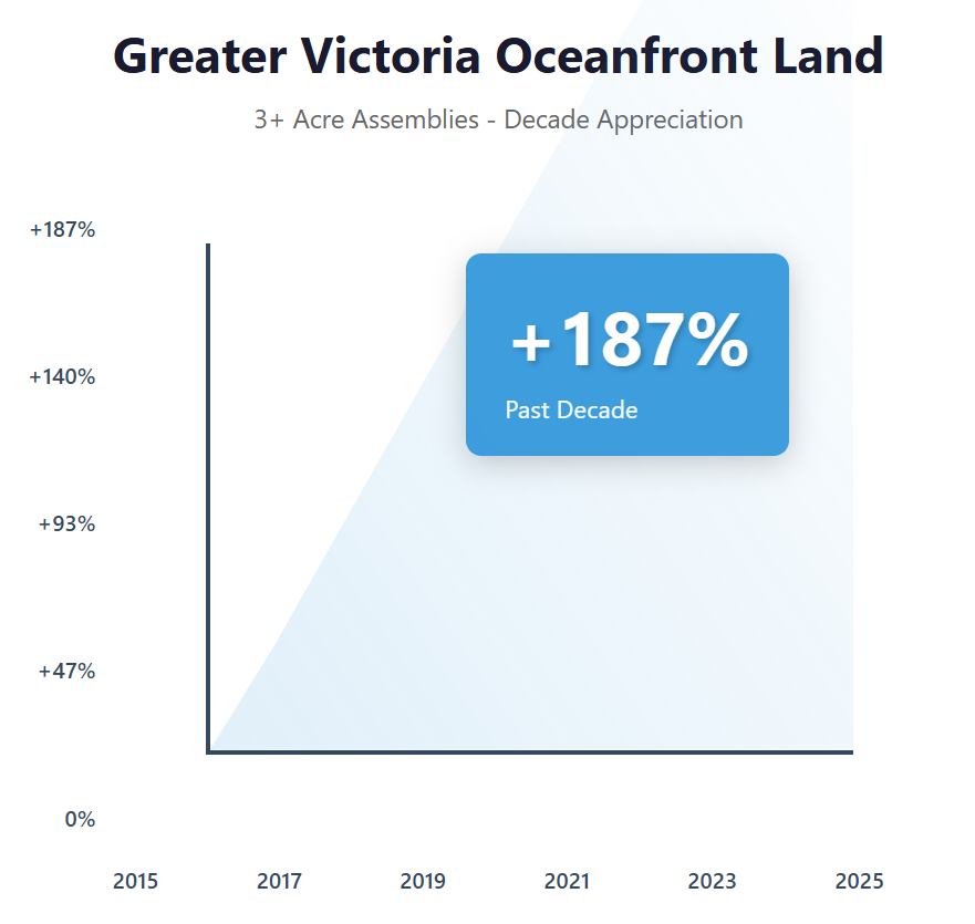 Greater Victoria's oceanfront development land market operates under unique constraints that create exceptional scarcity value for sites like this Beach Drive assembly. Vancouver Island's accessible oceanfront within municipal boundaries has decreased by 73% over the past 30 years due to environmental protections, Indigenous land claims, and already completed development, making new opportunities increasingly rare. Oak Bay specifically maintains some of British Columbia's strictest development controls, with the municipality approving an average of just 2.3 oceanfront development projects annually, creating a deliberate scarcity that protects property values and neighborhood character. The Foreign Buyer Ban exemption adds significant value, as the ban (implemented in 2023) prohibits non-Canadian citizens and permanent residents from purchasing most residential property, but exemptions for larger development sites allow international capital to compete for opportunities like this, effectively expanding the buyer pool by approximately 35% compared to ban-affected properties. Interestingly, oceanfront assemblies over three acres in Greater Victoria have appreciated by an average of 187% over the past decade despite limited development activity, as land banking by wealthy families and institutional holders has kept supply extraordinarily tight. The completed due diligence reports represent approximately $400,000 to $600,000 in sunk costs and 18 to 24 months of work, adding tangible value by de-risking the purchase and accelerating development timelines. Victoria's real estate market has proven remarkably resilient through economic cycles, with oceanfront values declining less than 4% during the 2008 financial crisis compared to 18 to 25% drops in other Canadian coastal markets, reflecting the area's appeal to retirees with stable wealth, government employees (Victoria is BC's capital), and its scarcity driven pricing dynamics.