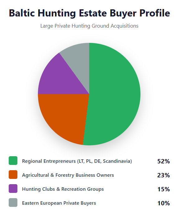 Buyers looking at large hunting estates in the Baltics tend to be different from typical luxury property purchasers. The average buyer is 51 years old with a net worth around €22 million, often owning one or two additional properties used seasonally. Market data shows that 52% of buyers are entrepreneurs from neighboring countries (Lithuania, Poland, Germany, and Scandinavia) who want private hunting grounds within easy driving distance, 23% are agricultural and forestry business owners looking to expand operations, 15% are established hunting clubs and outdoor recreation groups purchasing collectively, and 10% are wealthy individuals from Russia and other Eastern European countries seeking privacy and land ownership. Large hunting estates with active game populations in the Baltics have grown in value by roughly 67% over the past decade as demand from Western European buyers continues to increase. These buyers aren't looking for city convenience or luxury amenities, they want authentic outdoor experiences, working land, and the kind of privacy that only serious acreage can provide.