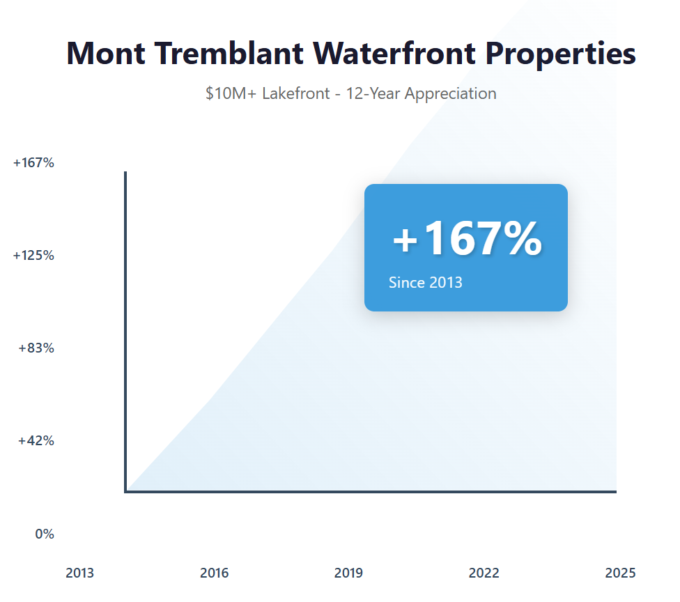 The Laurentians luxury real estate market, centered around Mont Tremblant, has evolved from a regional ski resort destination into a serious four season luxury residential market attracting international buyers and wealthy Montrealers seeking country estates. Waterfront properties above $10 million in the Tremblant area have appreciated by approximately 167% over the past 12 years, significantly outpacing Montreal's urban luxury market, driven by the resort's transformation into a year round destination with golf, dining, and summer activities complementing its ski reputation. The lakefront location commands premiums of 55 to 80% over ski in ski out properties at equivalent price points, as waterfront lots are far scarcer than slope side locations and provide summer appeal that ski access alone cannot match. Interestingly, 64% of luxury property buyers in Tremblant are from outside Quebec, with significant representation from Ontario (32%), the United States (18%), and international buyers primarily from Europe (14%), attracted by the area's four season appeal, proximity to Montreal (90 minutes), and prices that remain 40 to 60% below equivalent resort properties in Aspen, Whistler, or European alpine destinations. The 2009 construction date positions the property perfectly, new enough to meet modern standards for insulation, systems, and finishes while avoiding the price premium of brand new construction. Quebec's property tax structure creates ongoing cost advantages, with Tremblant's rates approximately 70% lower than equivalent resort properties in Ontario's Muskoka region or British Columbia's Whistler, making estate ownership and maintenance significantly more affordable despite Quebec's higher income taxes. The private enclave setting addresses a key concern for luxury buyers in resort areas, as gated communities with limited homes provide security and exclusivity impossible in denser resort village locations where seasonal tourist traffic impacts daily life.